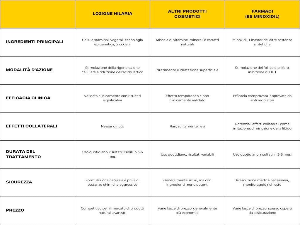 Infine, la formulazione di Hilaria è naturale e priva di sostanze chimiche aggressive, assicurando una sicurezza aggiuntiva per il consumatore rispetto a prodotti concorrenti che potrebbero includere ingredienti meno sofisticati. Anche in termini di prezzo, Hilaria mantiene un posizionamento competitivo, considerando l’avanzate caratteristiche naturali e scientifiche, offrendo così un ottimo rapporto qualità-prezzo rispetto a trattamenti alternativi che, pur essendo spesso più economici, risultano meno efficaci e affidabili nel lungo periodo.