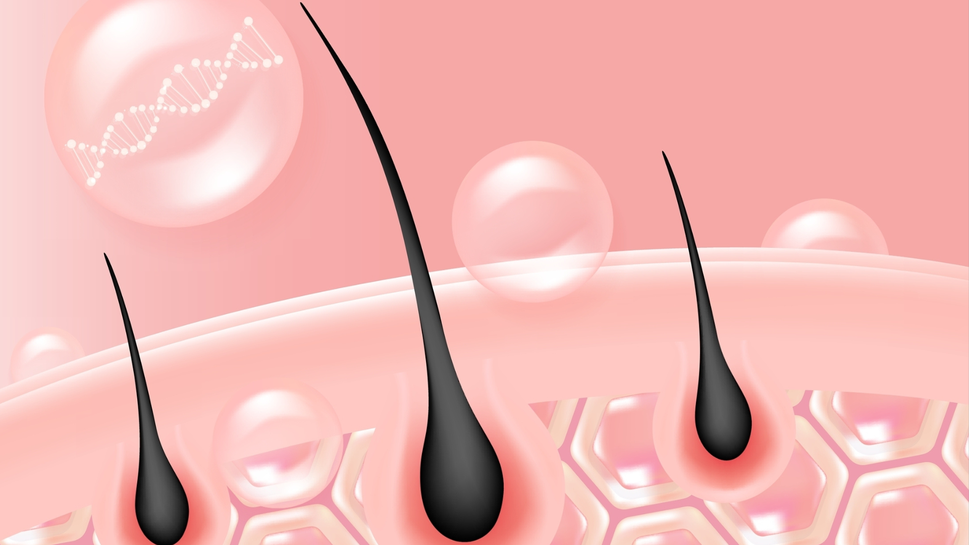 E’ in grado di mimare i fattori di crescita delle unità follicolari distrofiche penetrando nel derma, fino a riattivare l’angiogenesi follicolare, frenando la formazione di acido lattico e squalene dannose per la ricrescita del capello, limitando e riducendo sensibilmente il verificarsi del telogen effluvium.