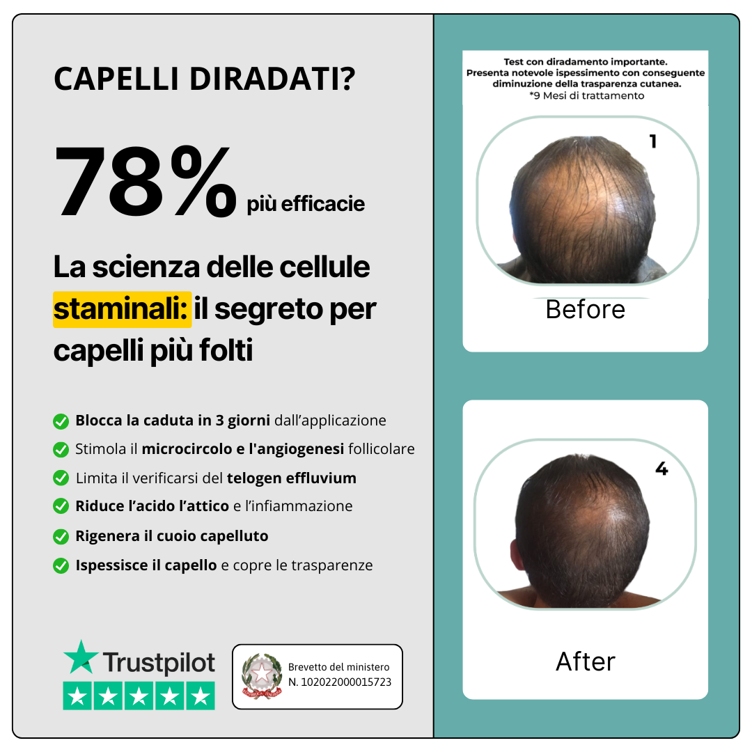 Il risultato è un maggior ancoraggio del follicolo sulla cute, un aumento dello spessore del fusto e una maggior cheratinizzazione visibile in appena due mesi dal primo utilizzo.